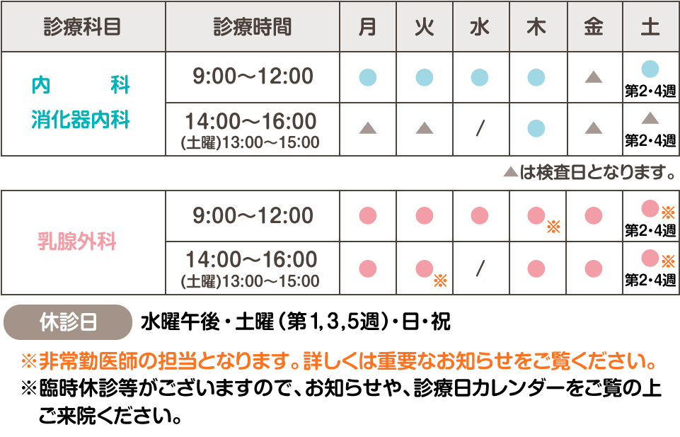 当クリニックでは、患者さんの症状に応じて、胃カメラ、大腸カメラ,マンモグラフィ検診、レントゲン検査、超音波検査、心電図検査,血液検査などを行っています。 診療内容は消化器内科,乳腺外科,外科,内科です。専門外の疾患については信頼出来る医師をご紹介致します。手術などを必要とする場合にも迅速に適切な専門医、医療機関をご紹介致します。 皆さんのホームドクターとして何でもお気軽にご相談下さい。